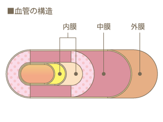 動脈の構造は内膜、中膜、外膜の三層からなっています。この中で中膜は、筋肉の輪になって動脈に弾力性をつける働きをしています。