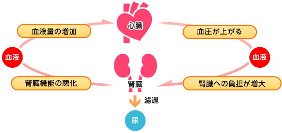 腎臓はナトリウムや水分の量を調節して、血液の量を一定に保つ役割を持っています。 この機能が低下すると、血液の量が増えて血圧が上がります。