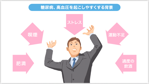 高血圧が直接原因となる病気ではありませんが、高血圧の人は血圧が正常な人に比べて2〜3倍糖尿病になりやすいとされています。また、日本では糖尿病がある人の半分は高血圧とされ、どちらかの病気があると、両方を合併しやす いという特徴があります。